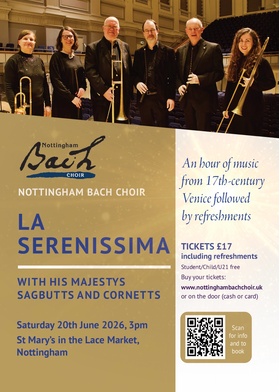 Nottingham Bach Choir is a friendly auditioned choir of around 80 singers which performs at least three concerts annually. Its wide repertoire includes a major Bach work each year.